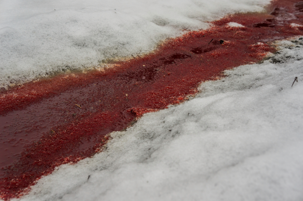 The change is immediate and dramatic. What was once clear becomes vividly red, creating the illusion that the glacier itself is bleeding.