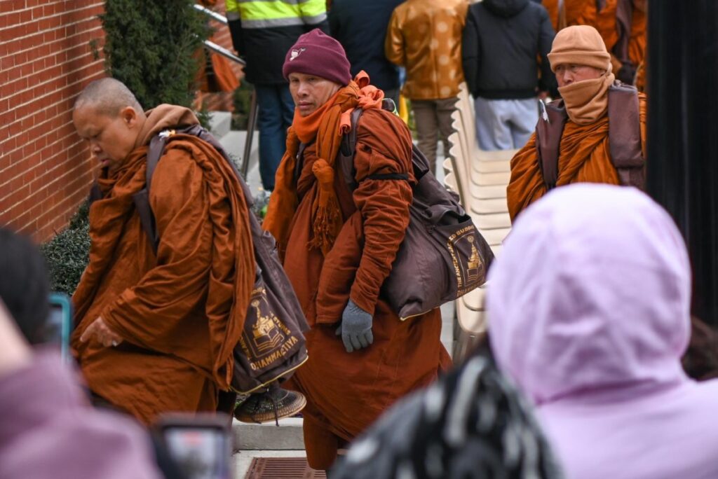 Crowds began gathering along roadsides near Apex on Friday. By Saturday, hundreds had become thousands. People pressed their palms together in the traditional greeting. Many bowed. Some knelt on cold pavement. Others prostrated themselves on the ground as monks passed. Tears flowed freely among strangers who had traveled from across the state and beyond.