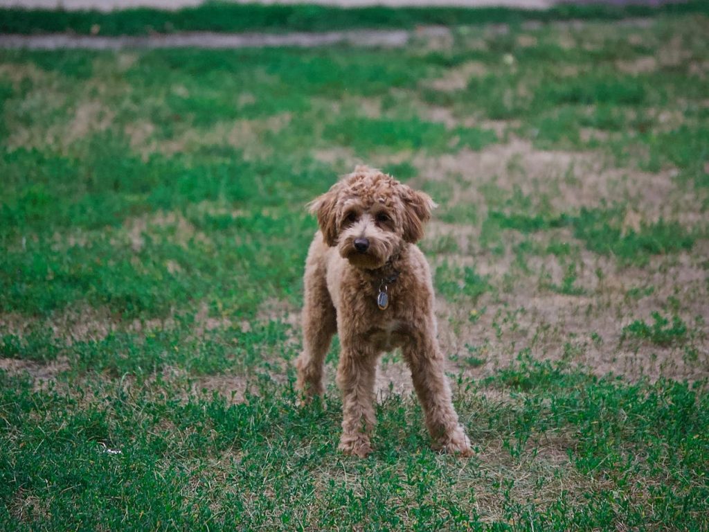 The curly hair framing his face adds to the anthropomorphic effect, creating a silhouette that reads more like a person wearing a dog costume than an actual canine. His melancholic expression, though natural to his breed combination, mimics human emotional displays with uncanny accuracy.
