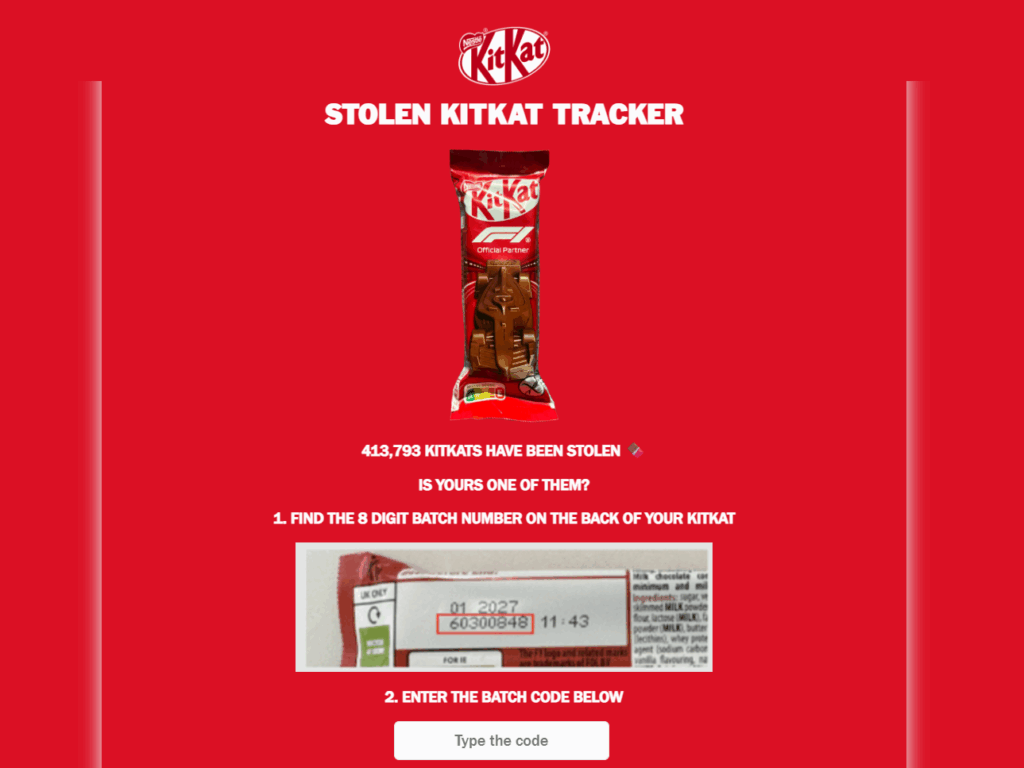 After speculation spread online that the whole thing might be an elaborate publicity stunt or an April Fools’ joke, the company doubled down publicly and insisted it was genuine. Then it launched what it called the “Stolen KitKat Tracker,” a tool that allows customers and retailers to enter the eight-digit batch code printed on the back of a KitKat wrapper to check whether it belongs to the stolen shipment.