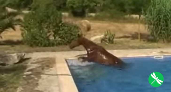 Not only does this horse leap into the pool, but it takes a thorough lap of the water, enjoying the refreshing experience. When it’s time to get out, it has a slight struggle on the slippery stairs, seeming as though it’s not entirely sure where to place its hooves without falling back into the water. After a bit of strategic work, however, the horse manages to climb out, splashing water around the pool while it saunters away.